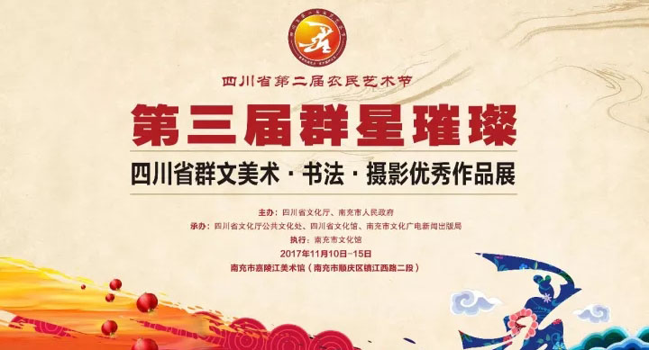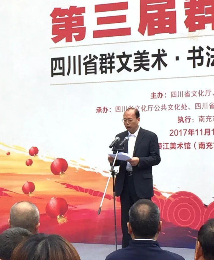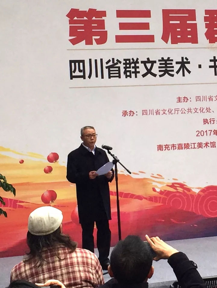 为庆祝党的十九大胜利召开,由四川省文化厅、南充市人民政府主办,四川省文化馆、四川省文化厅公共文化处、南充市文化广电新闻出版局等承办的四川省第二届农民艺术节、第三届“群星璀璨”四川省群文美术书法摄影优秀作品展今天下午在美丽的丝绸之都、水果之乡南充嘉陵江美术馆盛大开幕! 参加开幕式的领导和嘉宾有: 四川省文化厅党组书记、厅长,省文物局局长周思源同志 中共南充市委常委、宣传部部长何迎晓同志 四川省文化厅副厅长赵红川同志 南充市人民政府副秘书长李斌同志 四川省文化厅公共文化处处长王成平同志 南充市文化广电新闻出版局局长陈家喜同志;来自各市州宣传文化部门、参展艺术家代表,新闻媒体的朋友们和南充市西华师范大学师生代表等300余人出席了开幕式! 此次展览,共荟萃了来自全省群文战线和农民艺术家代表的精品力作355件,其中美术、书法、摄影作品各100件,农民画55件。这些作品具有鲜明的巴蜀文化特色和浓郁的生活气息,相信会给大家带来美的享受。 本届展览活动得到了全省各地文化部门的高度重视,广大群文艺术工作者和社会各界群众美术、书法、摄影精英以及爱好者踊跃参与,积极创作艺术精品,活动的号召力和影响力不断增强。活动组委会共收到全省各地从5000余件作品中层层选拔上来的作品600余件。经专家组严格评审,从中选出355件作品参展,其中美术、书法、摄影作品各100件,农民画55件。这些选拔出的作品风格各异、精彩纷呈,富有浓郁的巴蜀地域特色和时代精神风貌,成为体现这个伟大时代的深刻印记。艺术家们倾情泼墨,将对四川的眷恋与祝福注于笔端,正所谓:“丹青溢彩歌时代,翰墨留香颂盛会!”