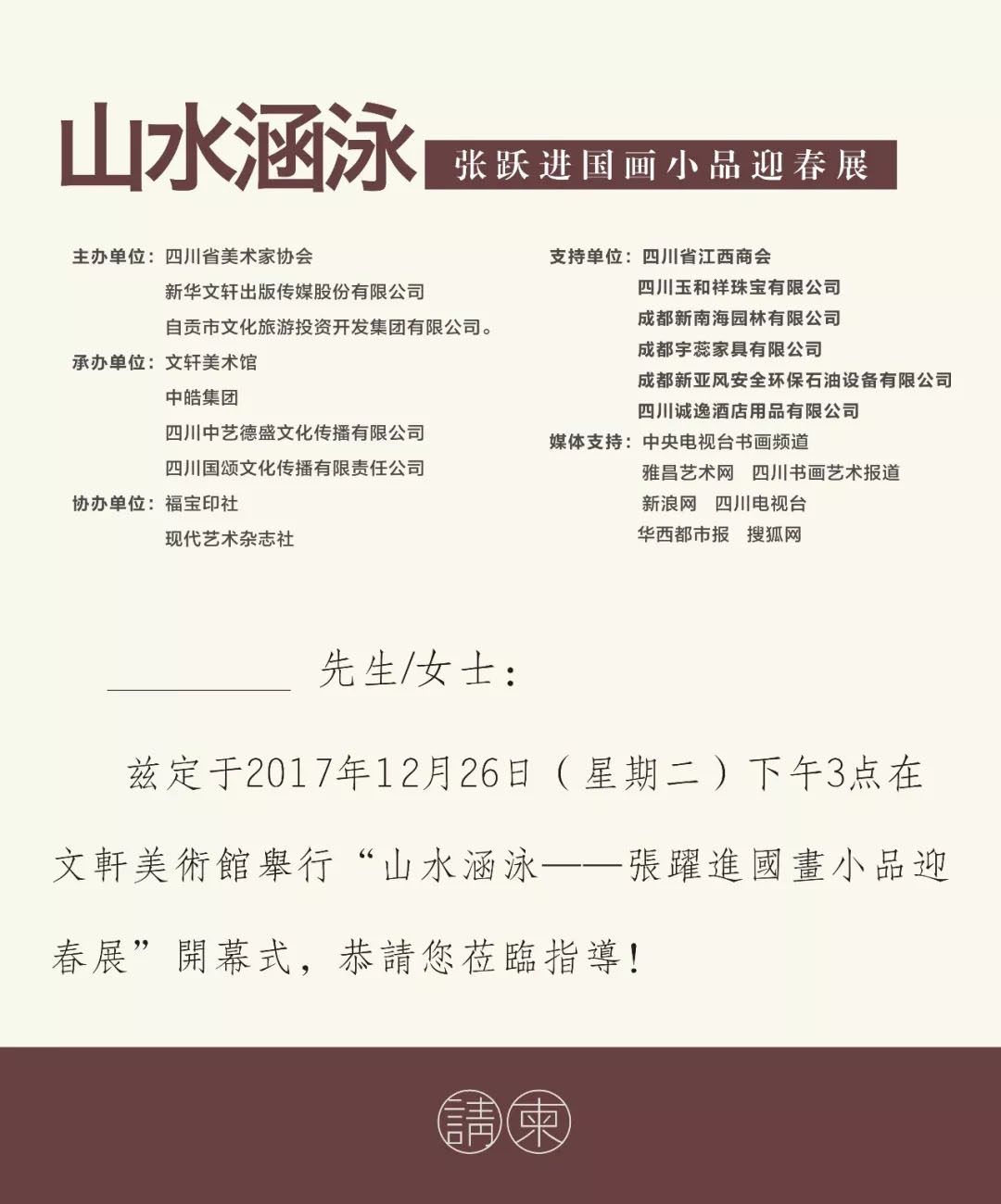 主办单位 四川省美术家协会 新华文轩出版传媒股份有限公司 自贡市文化旅游投资开发集团有限公司 承办单位 文轩美术馆 中皓集团 四川中艺德盛文化传播有限公司 四川国颂文化传播有限责任公司 协办单位 福宝印社 现代艺术杂志社 支持单位 四川省江西商会 四川玉和祥珠宝有限公司 成都新南海园林有限公司 成都宇蕊家具有限公司 成都新亚风安全环保石油设备有限公司 四川诚逸酒店用品有限公司 展览指导 蔡家骏 学术主持 陈 荣 推广总监 万 鹏 开幕时间 2017年12月26日下午15:00 展览地址 文轩美术馆(成都市高新区新会展中心208-1-1) 媒体支持 中央电视台书画频道 雅昌艺术网 四川书画艺术报道 新浪网 四川电视台 华西都市报 搜狐网