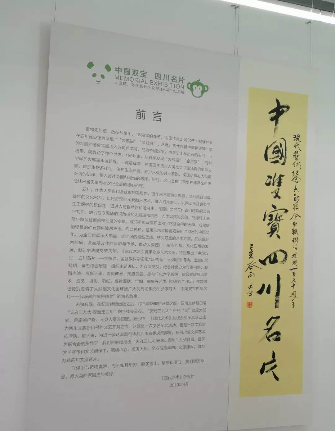 2019年4月22日14点30分,为纪念大熊猫、金丝猴科学发现150周年,献礼中法建交55周年,并更好展示大熊猫、金丝猴的自然灵趣与艺术之美,感受“中国双宝•四川名片”的艺术内涵,推动大美四川、生态四川、文化四川的发展,进一步加强四川文化交流,促进中华文化传播。由四川省文学艺术界联合会指导,中共成华区委宣传部、《现代艺术》杂志社主办,福宝美术馆、四川省文艺期刊联合会、四川天娇大熊猫画院承办,四川国颂书画院、北京巴蜀书画艺术院协办的“中国双宝·四川名片——纪念大熊猫、金丝猴科学发现150周年纪念展”系列活动在福宝美术馆隆重开幕!