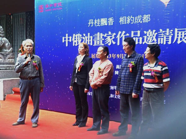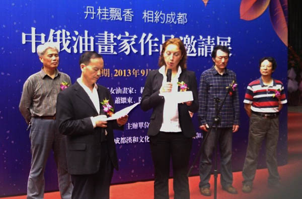 金秋时节,丹桂飘香。为增进中俄两国人民之间友谊,促进文化艺术交流,由四川省美术家协会、四川汉和文化有限公司联合举办的“中俄油画家作品邀请展” 于2013年9月21日至9月27日在汉和书院举行,为金秋的蓉城画坛增添了一道新的风景。!四川省文化厅原副厅长张在德到场祝贺,成都市美协领导及各界人士200余人参加了开幕式。 应邀参加本次展览的有俄罗斯圣彼得堡美术家联盟理事、俄罗斯归家博物馆特聘画师、俄罗斯当代现实主义油画界具有代表性的女画家—莉莎•米哈伊洛娃女士的精品,也有本土实力派著名画家、中国美术家协会会员萧继东、陈登木、宋志江和四川美术家协会会员邵智四位先生的力作。她(他)们同是表现大自然的具象主义画家,也是现实主义艺术的守望者。展出的49幅作品清新自然、色彩明亮,雄浑大气、拙朴浑厚,多角度地展示了中俄艺术家对家园的眷恋和对美好生活追求的精神风貌,充分抒发了热爱生活,热爱大自然,歌颂生命的炽热情怀。 莉莎•米哈伊洛娃是俄罗斯历史上国家博物馆为艺术家举办个人画展的最年轻的一位艺术家。近十年来她应邀在意大利、德国、法国、西班牙、瑞典等国举办个人画展,得到了画界同行及当地群众广泛的赞誉。此次是她首次到中国成都与本土画家联合办展。邀请展开幕的当天下午,莉莎•米哈伊洛娃参加了成都油画界的学术研讨会,与20多位同仁一起就油画艺术的现状与发展等问题进行了交流。