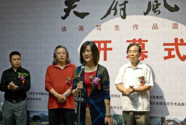 金色十月,秋高气爽。一场以展示天府秀美风光和质朴民风为主题的油画写生作品展,给美丽的蓉城增添了一道新的风景。昨日,由成都市文学艺术界联合会和成都市美术家协会主办,成都市美术家协会油画艺术委员会、蜀都书画院、四川良和慈航文化传播有限责任公司联合承办、四川省福宝斋艺术品展示制作中心协办的“天府风情--油画写生作品邀请展”,在浣花溪公园内的文艺之家拉开帷幕。成都市文学艺术界联合会副主席郭月和四川省美术家协会常务副主席兼秘书长梁时民、四川省美术家协会副主席、成都市美术家协会主席刘正兴等文艺界领导亲临展场祝贺并讲了话,成都各书画院负责人、知名画家和社会各界人士二百余人参加了开幕式。 “天府风情--油画写生作品邀请展”是成都市美协与民营企业家首次合作举办的油画写生作品展览。举办这个展览旨在倡导艺术创作面向生活,深入生活和表现生活。画展展出的50幅作品,虽然是受邀画家众多写生作品中的一部分,但却精华荟萃,精彩纷呈,多角度、多侧面地展示了天府四川的历史文化、人文景观和风土人情。一幅幅生动清丽的写实画面,记录着艺术家们对生活的热爱和对天府四川悠久历史文化的认知、感悟和思考,寄托着艺术家们浓郁的乡土情怀和对美好未来的希冀与追求。 此次以“天府风情”为主题的油画写生邀请展,得到了全市专业和业余油画家的积极响应和企业家的有力支持。大家一致认为,“天府风情”这个主题创意新颖,富有时代意味和本土特色,有必要坚持下去,继续围绕这个主题举办系列展览,挖掘天府之国厚重的历史文化积淀、描绘家乡优美的自然风光、人文景观,反映多姿多彩的民俗民情,展示人们的时代风貌。此次画展于10月16日结束。 (上图为:开幕式会场)