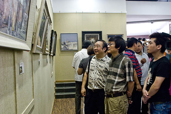 市文联副主席郭月与市美协主席刘正兴观看画展