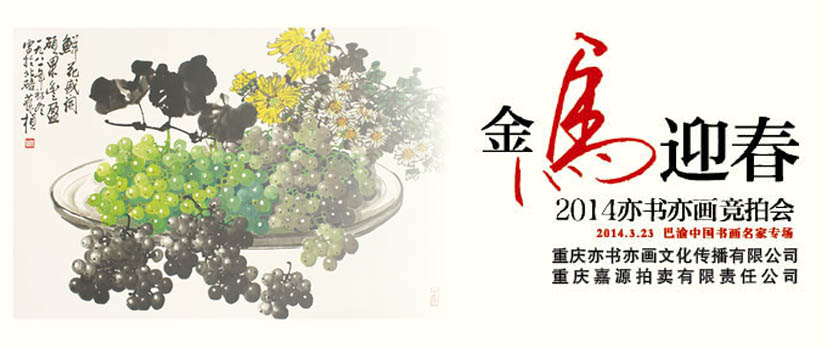 由重庆亦书亦画文化传播有限公司承办,重庆嘉源拍卖有限公司举办的“金马迎春2014亦书亦画迎春竞拍会”将于3月23日下午13:30在位于重庆市江北区鸿恩寺公园入口处的重庆群众艺术馆新馆举行,拍品共110件。预展时间:3月21日至22日。