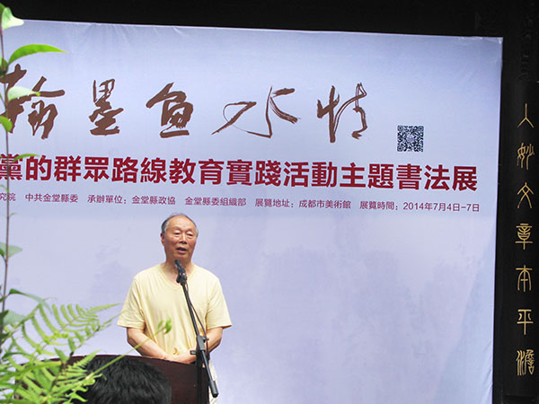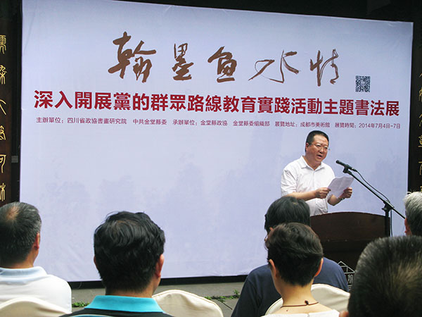 翰墨鱼水情——深入开展党的群众路线,教育实路活动主题书法展,2014年7月4日下午3点,在成都市美术馆隆重举行。 国泰而文化盛,文盛故书艺荣。正在全国上下开展的党的群众路线教育实践活动,既正党风更顺民意。我省一批优秀的书法艺术家,有感而发,因情而书。由四川省政协书画研究院与中共金堂县委共同主办,金堂县政协、金堂县委组织部承办的“翰墨鱼水情”主题书法展应时而呈。 字之有所出,文之有所载,义之有所彰,道之有所兴也。书法作为传承文明和记录文化的重要载体,已植根于华夏民族的精神深处,成为中国传统文化的精粹体现,光耀古今。本次书法展是省、市、县相关领导及数十位具有丰富生活阅历和扎实艺术功底的书法家的专题创作。他们以书法艺术独特魅力,尽情抒发殷殷为民情,大力讴歌拳务实心,深深激励铮铮清廉志,精心营造出了一曲浓郁的时代主旋律。近百件书法作品,笔酣墨饱,力透纸背,或气势磅礴,或和风细雨,墨韵间传递送巨大正能量,彰显出润物细无声的文化意境。 古有朝夕浸淫翰墨双修之功,今为艺术墨韵修身齐志之事。这是时代的笔墨,他不仅渗透着历史的人文积淀,而且蕴含着时代的鱼水精神,如果把党的群众路线教育实践活动喻为密切党群干群关系的沃土,那么本次展览便是点缀这片沃土的一抹绿荫。 愿我们携起手来,书写时代更美的篇章。 (上图为:四川省政协常务副主席晏永和宣布画展开幕)