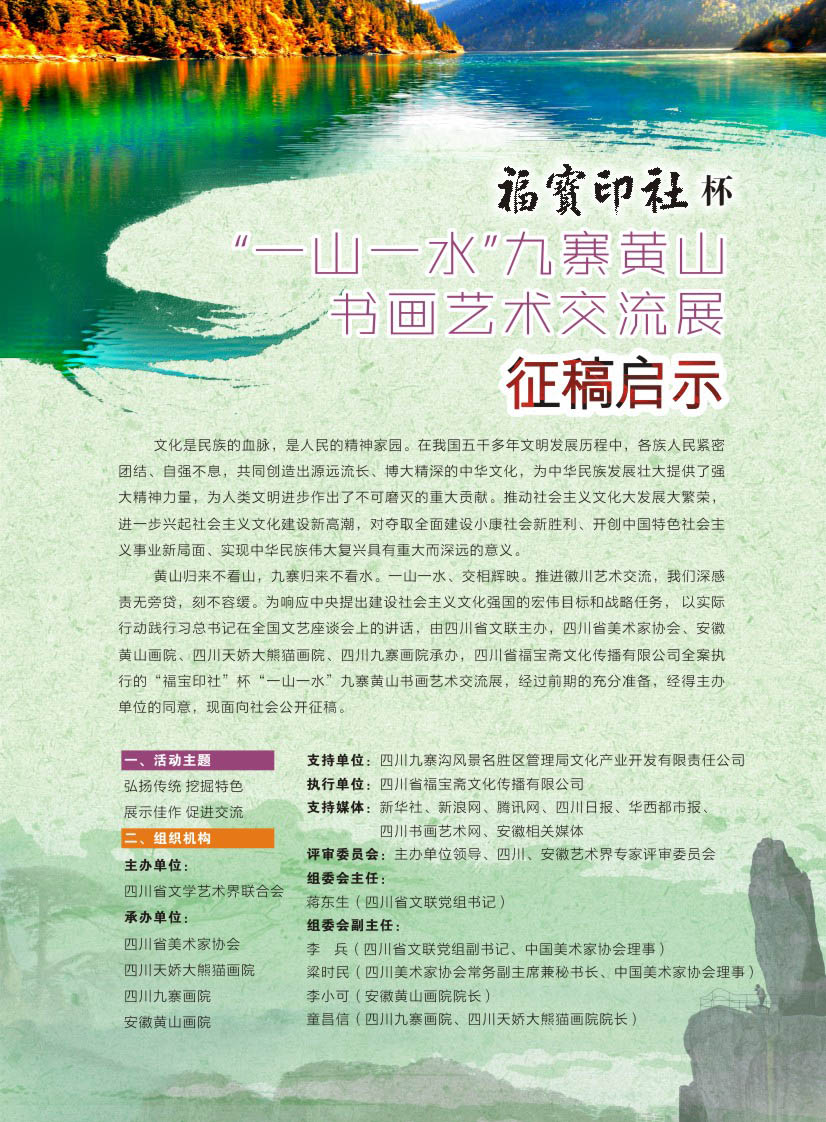 文化是民族的血脉,是人民的精神家园。在我国五千多年文明发展历程中,各族人民紧密团结、自强不息,共同创造出源远流长、博大精深的中华文化,为中华民族发展壮大提供了强大精神力量,为人类文明进步作出了不可磨灭的重大贡献。推动社会主义文化大发展大繁荣,进一步兴起社会主义文化建设新高潮,对夺取全面建设小康社会新胜利、开创中国特色社会主义事业新局面、实现中华民族伟大复兴具有重大而深远的意义。 黄山归来不看山,九寨归来不看水。一山一水、交相辉映。推进徽川艺术交流,我们深感责无旁贷,刻不容缓。为响应中央提出建设社会主义文化强国的宏伟目标和战略任务, 以实际行动践行习总书记在全国文艺座谈会上的讲话,由四川省文联主办,四川省美术家协会、安徽黄山画院、四川天娇大熊猫画院、四川九寨画院承办,四川省福宝斋文化传播有限公司全案执行的“福宝印社”杯“一山一水”九寨黄山书画艺术交流展,经过前期的充分准备,经得主办单位的同意,现面向社会公开征稿。