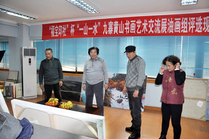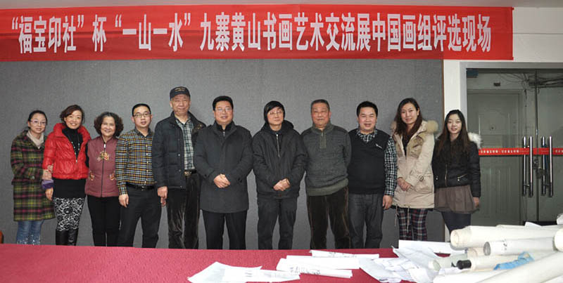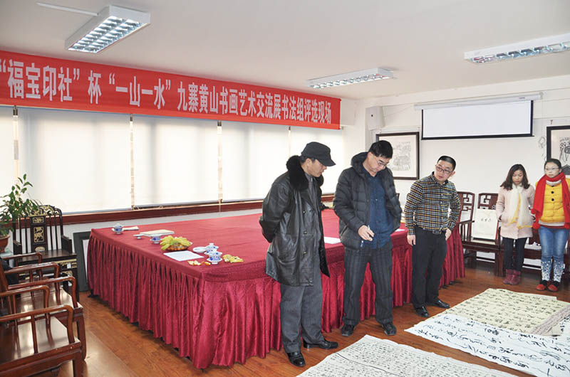 “福宝印社”杯“一山一水”九寨黄山书画艺术交流展评选于2015年1月13日下午在福宝印社学术厅圆满结束。评选出优秀作品10件,入选作品油画34件,书法19件,中国画86件。 “福宝印社”杯“一山一水”黄山九寨书画艺术交流展,报经四川省文学艺术界联合会,申请省文联作为主办单位,得到批准后,画展筹委会立即着手画展的各项准备工作。 征稿工作从2014年10月开始, 书画交流展征稿启事先后在《华夏大家》《中国画风》《将军艺苑》等专业艺术杂志;雅昌艺术网、雅昌论坛、四川书画艺术网等专业艺术网站、“福宝印社”微信平台先后登发并得到同行多家艺术机构的广为转发;在省内、国内及国际产生了广泛影响,效果颇佳。 应征者投稿积极踊跃,截止2014年12月31日止,画展共收到书画作品共459件,其中:国画275幅、油画97幅、书法87幅。 稿件来自全国各地:四川、湖南、江苏、河南、福建、江苏、浙江、重庆、安徽、山东、济南等省份; 安徽黄山画院高度重视、由院长李小可工作室集体创作6米黄山主题巨制大作、5幅黄山主题画作,参加本次艺术交流展。 更有来自法国蓬毕杜艺术中心画家索菲、俄罗斯列宾艺术学院功勋艺术家莉莎准备送作品参展;美藉画家黄薇更专程从美国寄来作品参展,足见其画展的广泛影响。 征稿结束后,画展筹委会于2015年1月6日,在“福宝印社”学术厅举行了画展筹备会,商议作品的评选日期、评委会组成、画展开幕、作品的出版、作品装框、展览场地、获奖作者产生办法等具体事宜进行了布署安排,并一一落实执行。