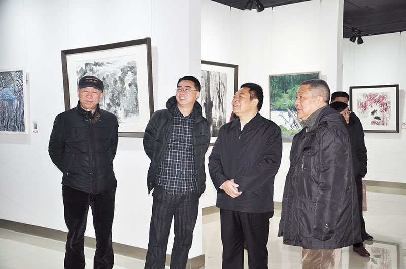 四川省书法家协会常务副主席兼秘书长戴跃(左2)四川省文联党组书法蒋东升(右2)四川省美术家协会副主席武海成(左1)九寨沟画院童昌信院长(右1)在展厅交流