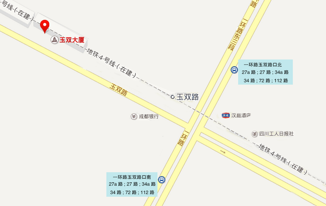可乘坐:27a路、27路、34a路、34路、72路、112路到达一环路玉双路口南/北,再步行至玉双大厦