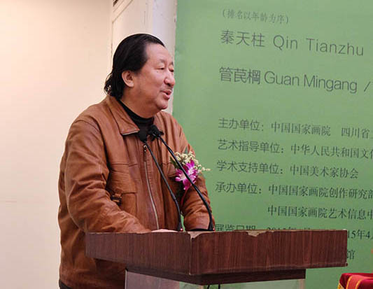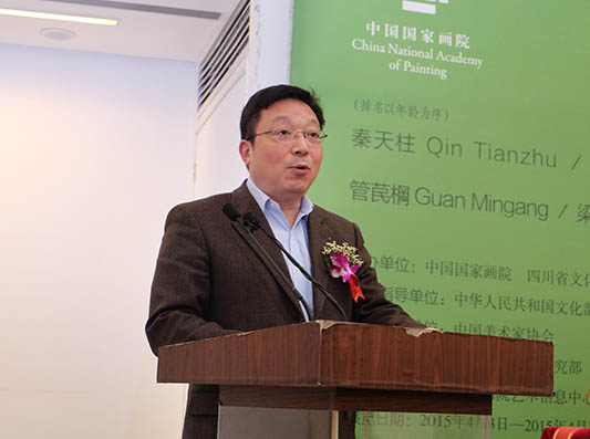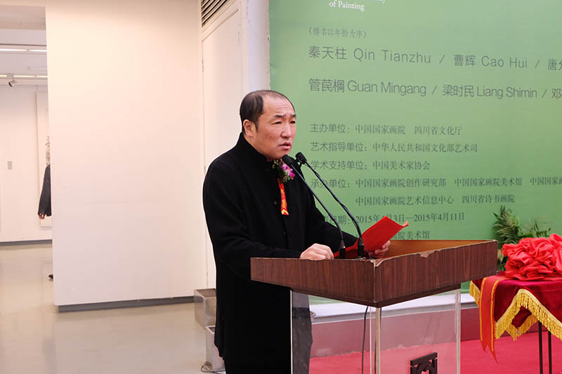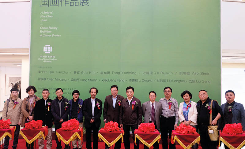 由中国国家画院、四川省文化厅主办,中国国家画院创作研究部、中国国家画院美术馆、中国国家画院美术研究院、中国国家画院艺术信息中心、四川省诗书画院承办的“新中国美术家系列·四川省中国画作品展”于2015年4月3日上午10:30分在中国国家画院美术馆隆重举行。开幕式由中国国家画院常务副院长卢禹舜主持,文化部艺术司副司长诸迪,原国家中央编办副主任王澜明,中国国家画院院长、中国美术家协会副主席杨晓阳,中国美术家协会副秘书长陶勤,中国国家画院副院长张晓凌、张江舟、赵卫、范扬,四川省文化厅艺术委员会主任、四川省诗书画院副院长胡继先,四川省文化厅副厅长窦维平,四川省文联党组副书记、四川省诗书画院副院长邓涛,北京画院常务副院长袁武,中国国家画院研究员张道兴、刘曦林、王镛、満维起、纪连彬、何加林、孔紫、林荣生等300余人出席开幕式。 经“新中国美术家系列·四川省国画作品展”筹备工作组、四川省诗书画院艺委会推荐,中国国家画院展览艺委会终评,精选出秦天柱、唐允明、曹辉、叶瑞琨、姚思敏、管苠棡、梁时民、李青稞、邓枫、刘浪涛、刘刚等四川省11位1949年以后出生的国画家的110件作品。 四川省福宝斋文化传播有限公司向运华、向运成两位经理出席了北京的开幕式。由该公司出版的《新中国美术家系列·四川省国画作品展》作品集大型画册,以其新颖大气、庄重现代的设计风格和高品质的印刷质量,受到现场嘉宾的高度赞评,被杨晓阳先生肯定为此次系列画展的标准画册模式。 展期将持续至4月10日。