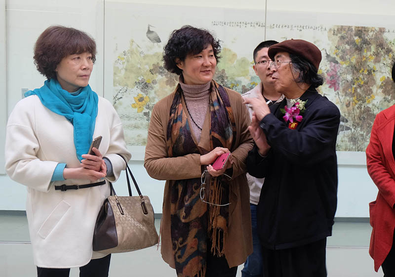 开幕式结束后,四川省美术家协会常务副主席、美术馆馆长梁时民先生,四川省美术家协会副主席、省诗书画院副院长管苠棢先生,四川中国画学会常务副会长、成都画院学术委员会主任叶瑞昆先生,省诗书画院专职书法家冷柏青先生与印制此次画展画集的福宝印社经理向运华、向运成合影