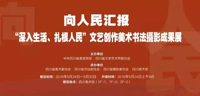 主办单位:中共四川省委宣传部 四川省文学艺术界联合会 承办单位:四川省美术家协会 四川省书法家协会 四川省摄影家协会 四川美术馆 展览执行:四川省福宝斋文化传播有限公司 展览时间:2016年5月24日—5月30日 开幕时间:2016年5月24日上午9点 展览地点:四川美术馆(1F-1、1F-2、2F-2)