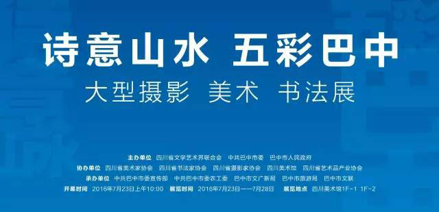 主办单位:四川省文学艺术界联合会 中共巴中市委 巴中市人民政府 协办单位:四川省美术家协会 四川省书法家协会 四川省摄影家协会 四川省艺术品产业协会 承办单位:中共巴中市委宣传部 中共巴中市委农工委 巴中市文广新局 巴中市旅游局 巴中市文联 展览执行:四川省福宝斋文化传播有限公司 开幕时间:2016年7月23日上午10:00 展览时间:2016年7月23日—7月28日 展览地点:四川美术馆1F-1、1F-2