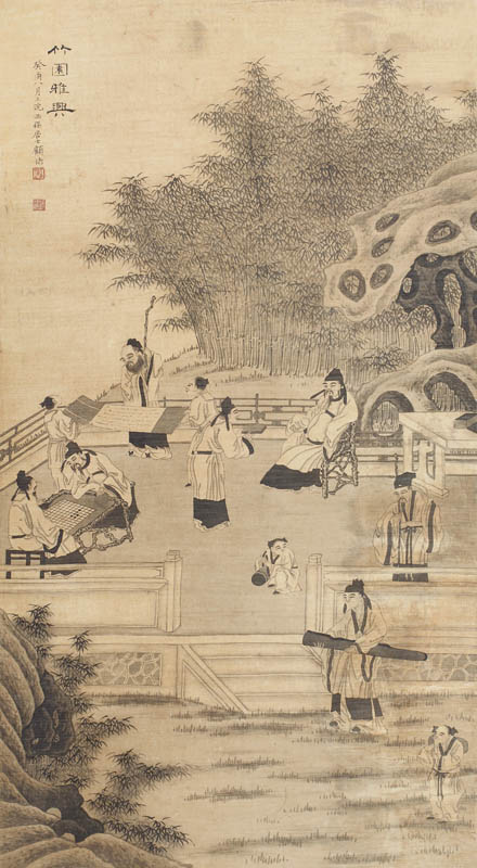 款识:竹园雅兴。癸酉八月上浣西梅居士顾洛。