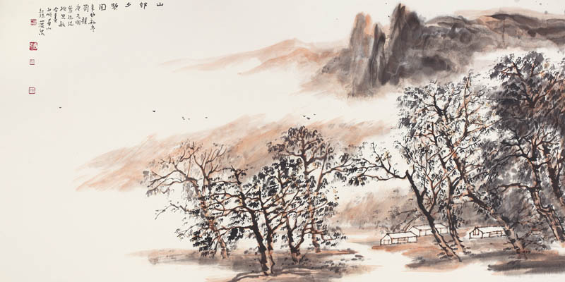 款识:山村夕照图。辛卯初冬刘朴、唐允明、叶瑞琨、姚思敏合画于峨眉山红珠山温泉。