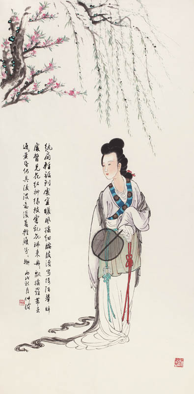 款识:纨扇轻裾到处宜,暖风摇曳细腰肢。漫步绮陌举眸处,瞥见花红柳绿枝。零乱花珮来冉冉,飘摇罗带去迟迟。黄昏仍具凌波意,漫着轻履步步趣。丙戌秋月仲海。