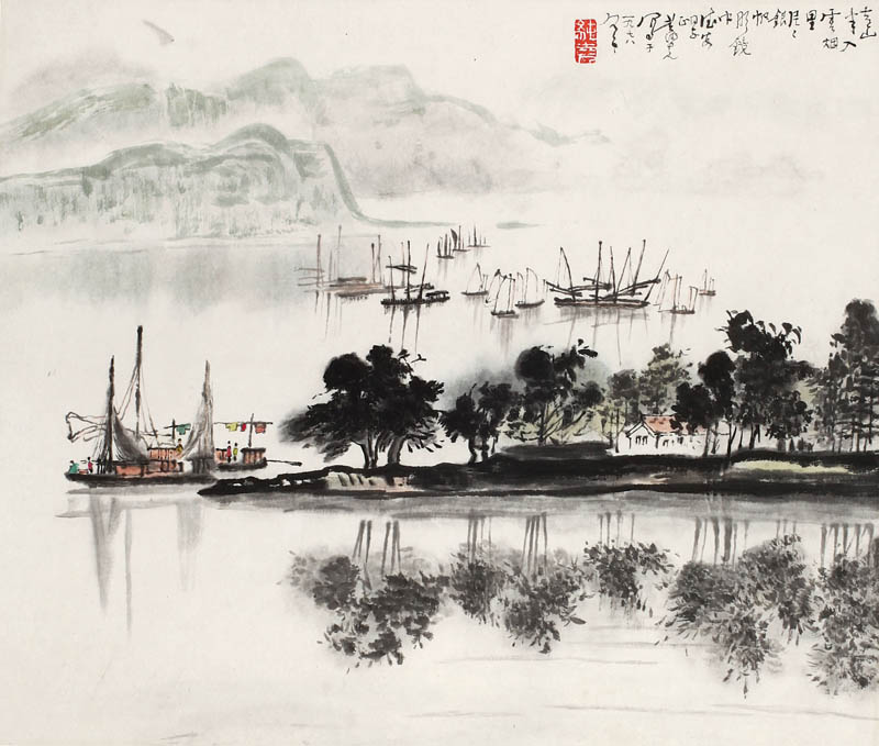 款识:青山半入云烟里,片片银帆行镜中。德安同志正,黄纯尧写于一九七八年。