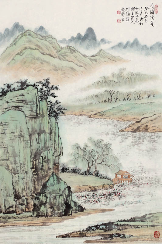 款识:荷塘清夏。癸巳早春二月古叙州临江高阁主昊人符阳罗远华写。