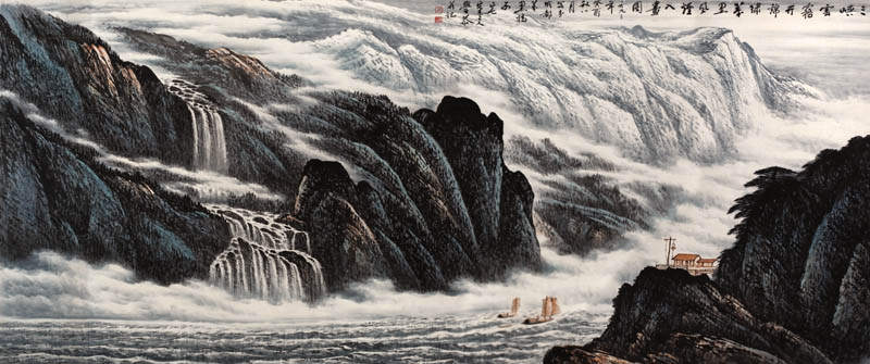款识:三峡云雾开锦绣,万里风烟如画图。一九九三年癸酉秋八月写于成都万里桥西宅,塞上人学恭并记。