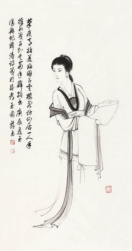 款识:笔底常拈美妇图,五云楼阁访仙居。一人手捧红笺子,知是当年薛校书。庚辰夏至漫兴作薛涛诗笺于成都玉园,蕴玉。