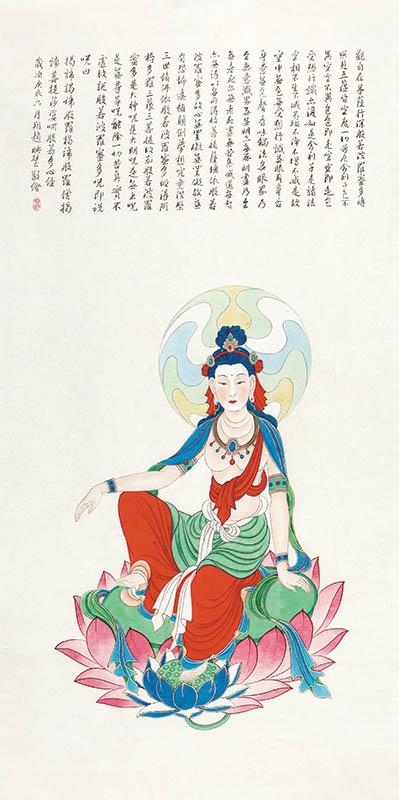 简介:赵映璧(b.1955):女,四川阆中人。四川巴蜀书画院特聘画师,著名画家赵蕴玉先生之女,深得其书画精髓,承袭其技法真章,且推陈出新,卓有建树。 款识:观自在菩萨,行深般若波罗蜜多时,照见五蕴皆空,度一切苦厄。舍利子,色不异空,空不异色,色即是空,空即是色,受想行识,亦复如是。舍利子,是诸法空相,不生不灭,不垢不净,不增不减。是故空中无色,无受想行识,无眼耳鼻舌身意,无色声香味触法,无眼界,乃至无意识界。无无明,亦无无明尽,乃至无老死,亦无老死尽。无苦集灭道,无智亦无得。以无所得故,菩提萨埵,依般若波罗蜜多故,心无罣碍,无罣碍故,无有恐怖,远离颠倒梦想,究竟涅磐。三世诸佛,依般若波罗蜜多故,得阿耨多罗三藐三菩提。故知般若波罗蜜多,是大神咒,是大明咒,是无上咒,是无等等咒,能除一切苦,真实不虚。故说般若波罗蜜多咒,即说咒曰:揭谛揭谛 波罗揭谛 波罗僧揭谛 菩提萨婆诃。《般若多心经》,岁次庚辰六月朔,赵映璧敬绘。 备注:附画家本人与该作品合影照片。