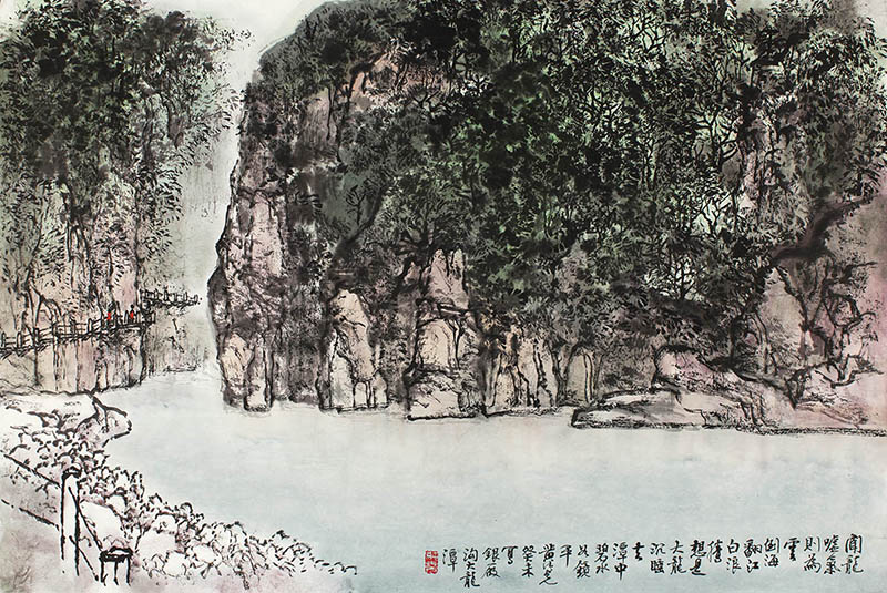 款识:闻龙嘘气则为云,倒海翻江白浪腾。想是大龙沉睡去,潭中碧水如镜平。黄纯尧癸未写银厂沟大龙潭。