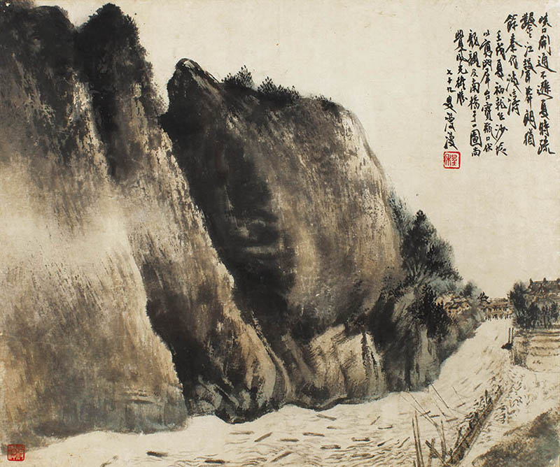 款识:峡口开通不逊夏时疏凿,江声莽朗尤余秦代波涛。壬戌夏初就飞沙埝斗犀台宝瓶口伏龙观及南桥于一图,尚觉风光雄胜。七十九叟漫漫。