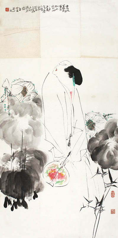 款识:看取莲花净,方知不染心。丁丑小夏写唐人诗意于古长安之郊静默斋,王西京并记。
