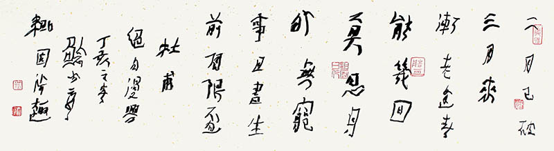 款识:杜甫绝句《漫兴》,丁亥之春鲶公云泉锄园涉趣。