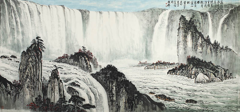 款识:飞泻三千丈,奔流万里程,推开拦路石,雷啸过山林,黄纯尧已卯再写旧稿于成都