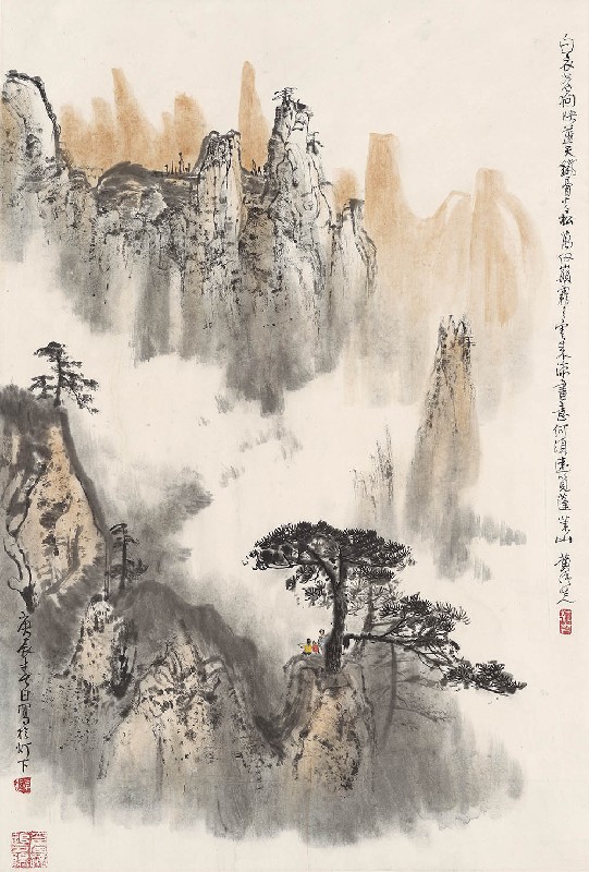 款识:白衣苍狗映蓝天,铁骨青松万仞巅。雾去云来添画意,何须远觅蓬莱山。黄纯尧。庚辰春日写于灯下。