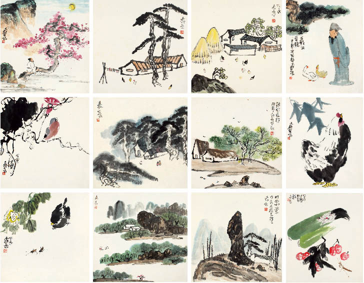 款识:1、寿岳。2、寿岳。3、羲之爱鹅。丁丑(1997年)夏于成都,寿岳。4、寿岳。5、戊寅(1998年)之夏,寿岳。6、川西小景。戊辰(1988年)友朋兄指正,寿岳。7、寿岳。8、癸未(2003年)之夏于锦里西,寿岳。9、癸未(2003年),寿岳。10、锦城近郊所见,寿岳写趣。11、寿岳。12、戊辰(1988年),寿岳写。