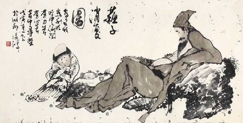 款识:苏子消夏图。为名忙,为利忙,忙中偷闲;劳力苦,劳心苦,苦中寻乐。戊寅夏写于成都,道鸿。
