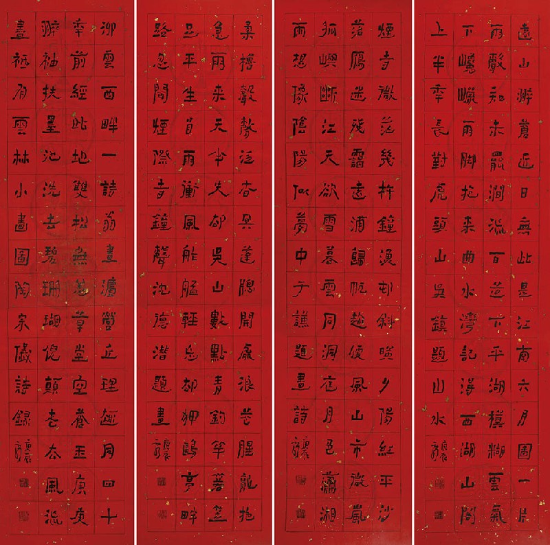 款识:1、沈德潜题画,庚辰,云泉。2、于谦题画诗,庚辰,云泉。3、吴镇题山水,庚辰,云泉。4、陶宗仪诗录,庚辰,云泉。