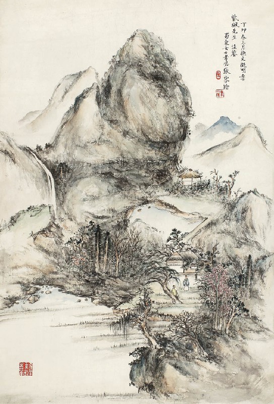 款识:丁卯春三月,抚文徵明意,紫珮先生法鉴,蜀东女士孝苾张兆芬绘。