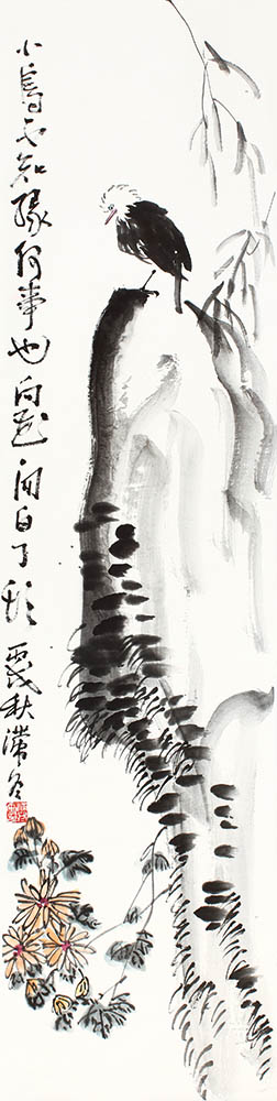 款识:小鸟不知缘何事,也向花间白了头。丙戌秋滞冬。