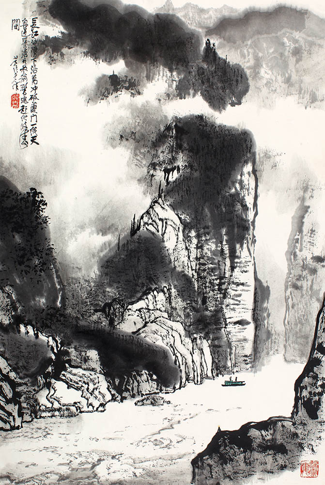 款识:长江汹涌下涪万,冲破夔门一线天。舟过瞿塘如放箭,惊魂起伏波涛件。黄纯尧作。