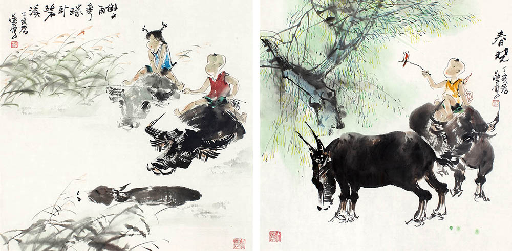 款识:1、双角弯环卧碧溪,丁亥春敬民写。2、春晓,丁亥春敬民写。