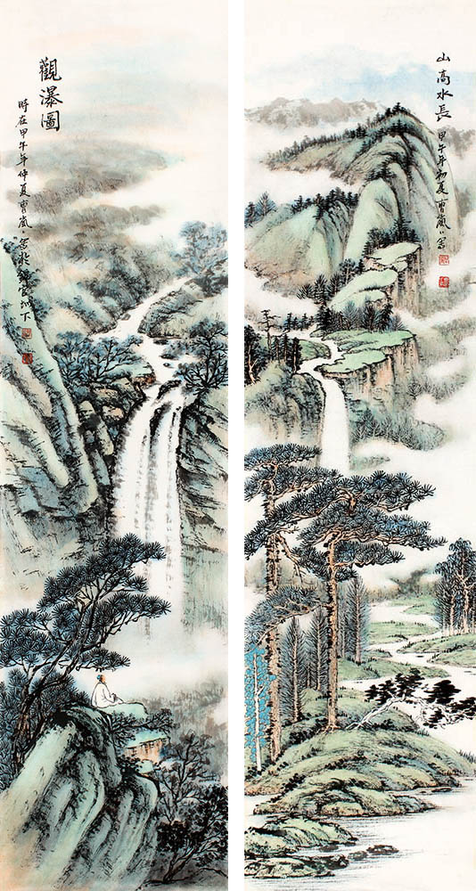 款识:1、山高水长。甲午初夏,曹岚岚写。2、观瀑图。时在甲午年仲夏曹岚岚写于锦官城下。
