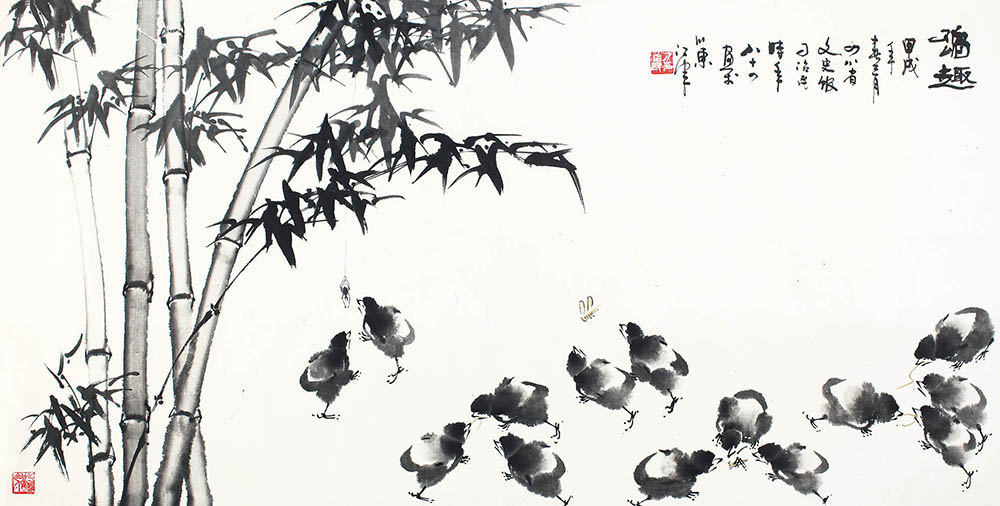 款识:雏趣。甲戌年春三月四川省文史馆刁治民时年八十四画于川东江津。