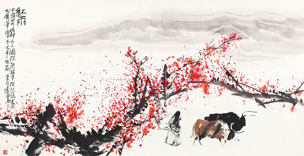 款识:红雨。中国四川成都“九三国际熊猫节---徐悲鸿艺术大展”,笔会于大千味苑。李金远画。