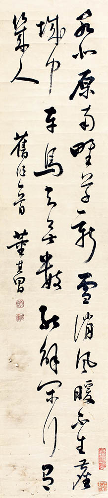 简介:董其昌(1555-1636):字玄宰,号思白、香光居士。松江华亭(今上海闵行区马桥)人,明代书画家。万历十七年进士,授翰林院编修,官至南京礼部尚书,卒后谥文敏。擅画山水,师法董源、巨然、黄公望、倪瓒,笔致清秀中和,恬静疏旷;用墨明洁隽朗,温敦淡荡;青绿设色古朴典雅。以佛家禅宗喻画,倡“南北宗”论,为“华亭画派”杰出代表。其画及画论对明末清初画坛影响甚大。书法出入晋唐,自成一格,兼有“颜骨赵姿”之美。 款识:旧作一首,董其昌。 译文:水北原南野草新,雪消风暖不生尘。城中车马知无数,能解闲行有几人。 备注:1、鉴藏印主人秦祖永(1825-1884):清代画家,号楞烟外史,金匮(今江苏无锡)诸生,官广东碧甲场盐大使。工诗古文辞,善书,尤嗜书画,而于六法力深研究,秦氏于画学见解极高,故出笔不落凡俗。以山水擅长,山水以王时敏为宗,而神理来化;补图小品,逸笔点缀,颇尽妙谛,尽擅胜场。著有《咸丰六年一八五六自序》《桐阴论画》《画学心印》《桐阴画诀》。卒年六十。2、鉴藏印主人吴观岱(1862-1929):名宗泰,又字念康,40岁改字观岱;号觚庐、洁翁,晚号江南布衣,无锡人。传世作品有《烟波罢钓图》、《仿宋人夏木山居图》、《江帆图》、《虹桥遗事图》、《松壑鸣泉图》、《寒梅冷月图》、《采莲图》等。宣统三年(1911)文明书局出版《吴观岱南湖诗意画册》,并著有《觚庐画草》行世。