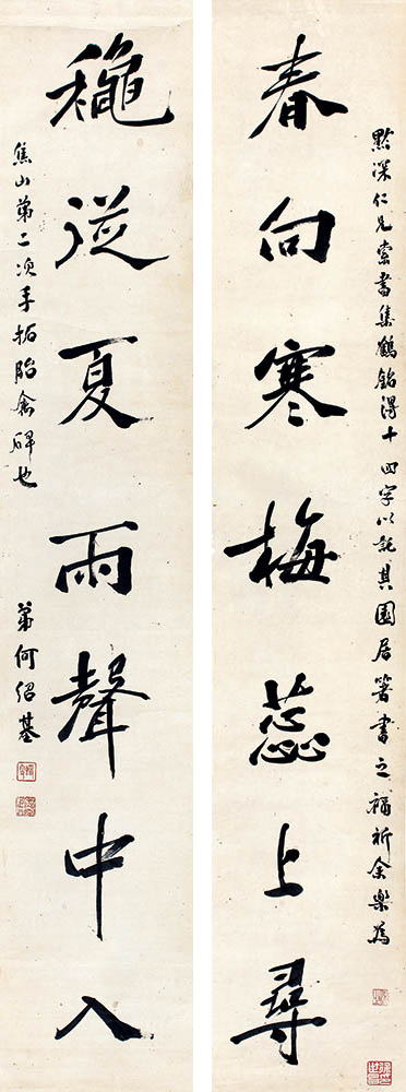 简介:何绍基(1799-1873):晚清诗人、画家、书法家。字子贞,号东洲,别号东洲居士,晚号蝯叟。湖南道州(今道县)人。道光十六年进士。咸丰初简四川学政,曾典福建等乡试。历主山东泺源、长沙城南书院。通经史,精小学金石碑版。据《大戴记》考证《礼经》。书法初学颜真卿,又融汉魏而自成一家,尤长草书。有《惜道味斋经说》、《东洲草堂诗·文钞》、《说文段注驳正》等著。 款识:默深仁兄索书《集鹤铭》,得十四字以託其园居,著书之福祈余乐为。焦山弟二次手拓胎禽碑也,弟何绍基。 译文:春向寒梅蕊上寻,秋从夏雨声中入。 备注:鉴藏印主人徐世昌(1855-1939):字卜五,号菊人,又号弢斋、东海、涛斋,直隶(今河北)天津人。前清举人,后中进士。自袁世凯小站练兵时就为袁世凯的谋士,并为盟友,一文一武,互为同道;1905年曾任军机大臣。徐世昌深谋远虑,颇得袁世凯的器重;但他又能与袁保持距离,进退有度,在袁称帝时以沉默远离之。1916年3月袁被迫取消帝制,恢复民国年号,起用徐为国务卿。1918年10月,徐世昌被国会选为民国大总统,辞掉总统职务后,多次拒绝日本人的劝诱,不供伪职。1939年6月5日,徐世昌病故,年85岁。徐世昌国学功底深厚,不但著书立言,而且研习书法,工于山水松竹,被称为“文治总统”。徐氏编书、刻书30余种,如《清儒学案》、《退耕堂集》、《水竹村人集》等。
