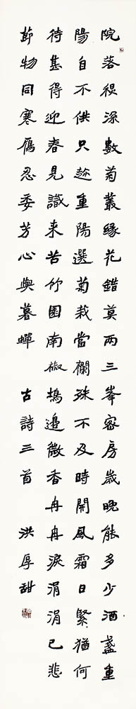 简介:洪厚甜(b.1963):生于四川什邡,号净堂。职业书法家。现为中国书法家协会理事,中国书法家协会楷书专业委员会委员,文化部中国艺术研究院中国书法院研究员,中国书法家协会书法培训中心教授、专家工作室导师,四川省书法家协会副主席、正体书专业委员会主任,四川省政协书画研究院专职副院长兼秘书长等。