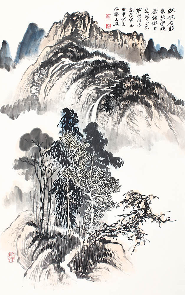 款识:秋涧石头泉韵细,晓峰细树乍生寒。写似前明同志惠存并正,壬申伏夏永年王遐。