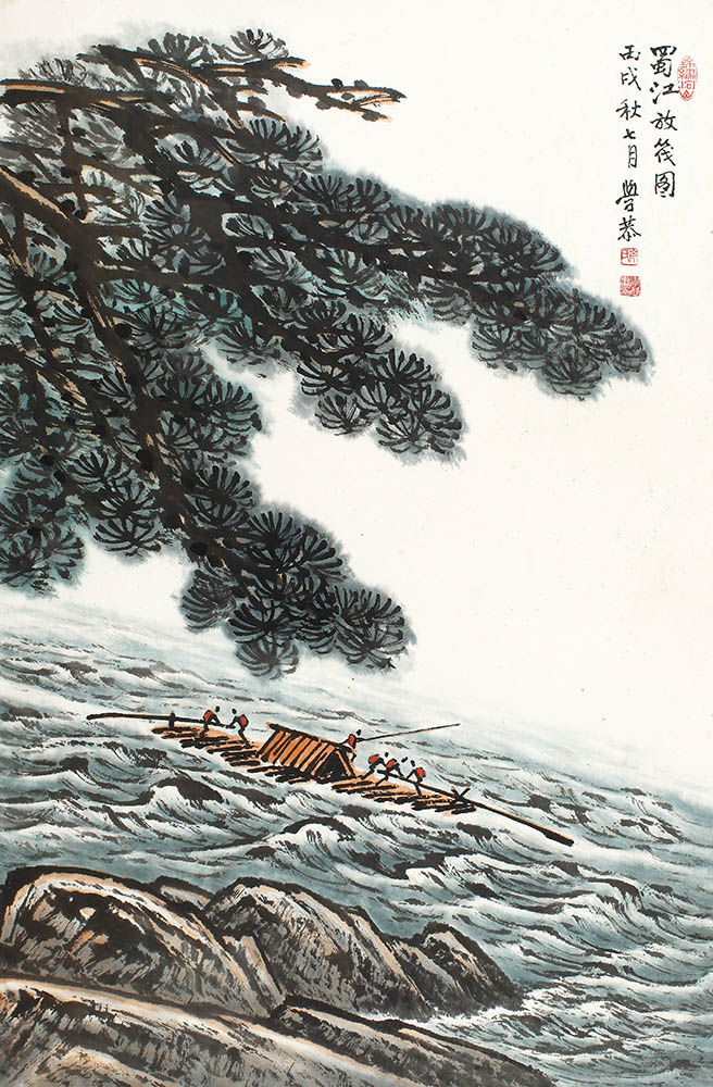 款识:蜀江放筏图。丙戌秋七月,学恭。