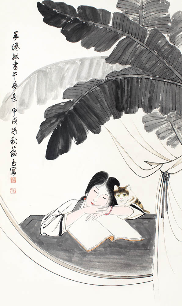款识:手倦抛书午梦长。甲戌凉秋蕴玉写。