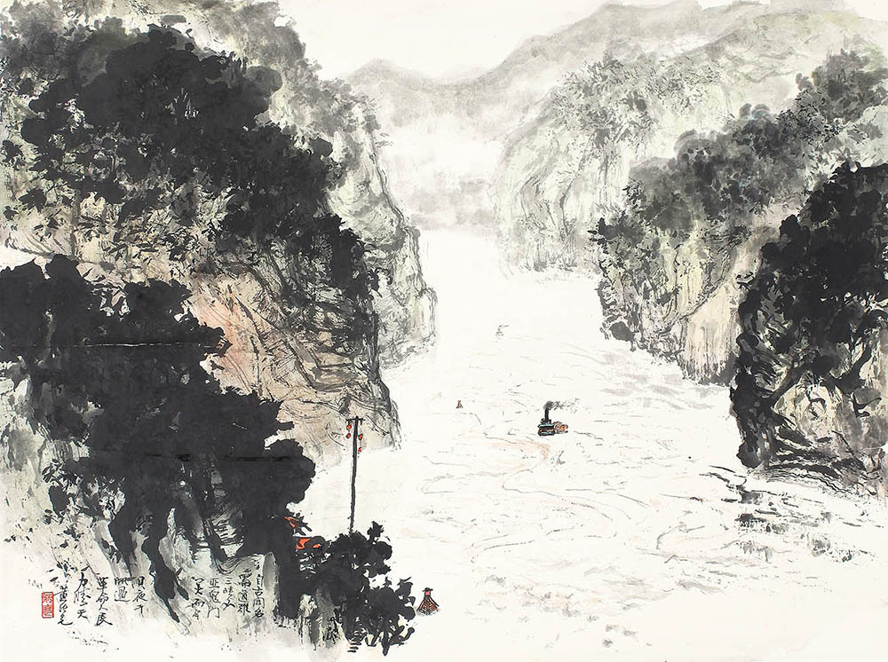 款识:自古闻名蜀道难,三峡不亚鬼门关。而今日夜千帆过,革命人民力胜天。黄纯尧。