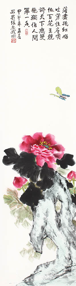 款识:落尽残红始吐芳,佳名唤作百花王。竞夸天下无双艳,独占人间第一香。甲午年孟春,西蜀张志武作。