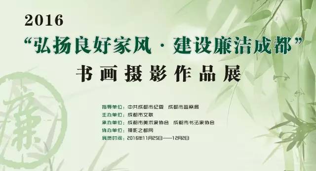 指导单位:中共成都市纪委 成都市监察局 主办单位:成都市文联 承办单位:成都市美术家协会 成都市书法家协会 协办单位:摄影之都网 展览时间:2016年11月25日——12月2日