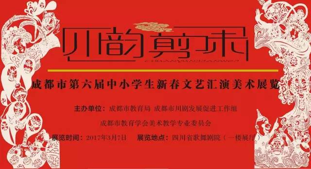 主办单位:成都市教育局 承办单位:成都市教育科学研究院 四川省歌舞剧院 四川七彩时光体育文化传播有限公司 展览时间:2017年3月7日 展览地点:四川省歌舞剧院(一楼展厅) 前 言 成都市中小学校的师生们在成都市教育局、成都市川剧发展促进工作组,成都市教育学会美术教学专业委员会的共同关心和领导之下,充分发扬本土特色,将“川剧文化进校园”系列活动作为剪纸创作题材,创作出了大量的川剧剪纸作品。为了创作这些前所未有的,有川韵剪味的独特作品,他们看川剧,在川剧的故事情节中激发创作的灵感;他们唱川戏,在川剧的一腔一调中领悟构图的韵律;他们演川剧,在川剧的一招一式中感受动态的美感。再将川剧艺术与同样博大精深的民间剪纸艺术融会贯通,创作出了成都市中小学校师生们眼中的有独特川味的现代剪纸作品。 今天呈现您眼前的仅仅是成都市中小学校师生们创作的近万幅川剧剪纸作品的一小部分。这些剪纸作品表现的不仅仅是师生们对川剧的热爱,更是对美好生活的向往。这里盛开的剪花,是千年积淀的深厚传统文化滋养出的艺术之花,更是用心血浇灌的美育之花。也许有些作品还显稚嫩,也许有些作品还不够完美。但是,成都市中小学校的师生们这种跪地学古人,顶天写自己的大气概值得我们点赞。
